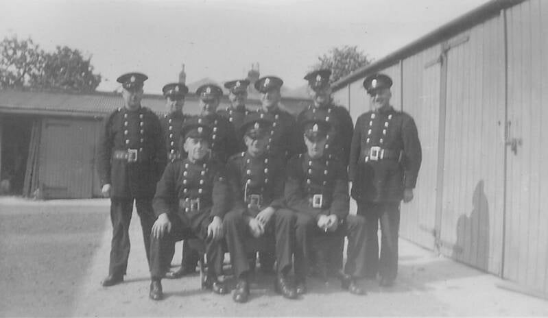 Ryde Fire Brigade 1935. Fireman Bartrum is at the rear right alongside Chief Officer Jolliffe.