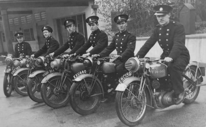 His record includes references to special qualifications such as his skills as a plumber and a St Johns first-aid medallion, but two photographs supplied by Reginald’s daughter Janet, suggest that he may have been qualified as an engine driver and motorcycle messenger. When the NFS was formed the Isle of Wight became Fire Force 14 Division D of Region 6 – Southern. The Fire Force driving school was located in Havant Road, Drayton, Hampshire. The two photographs show Reginald at this location, one in a typical end-of-course photo with a group of colleagues, and the other as one of six firemen astride motorcycles marked FF14 (the building that accommodated FF14 driving school remains in place, with minor structural alterations, operated today by Hampshire Car Sales).