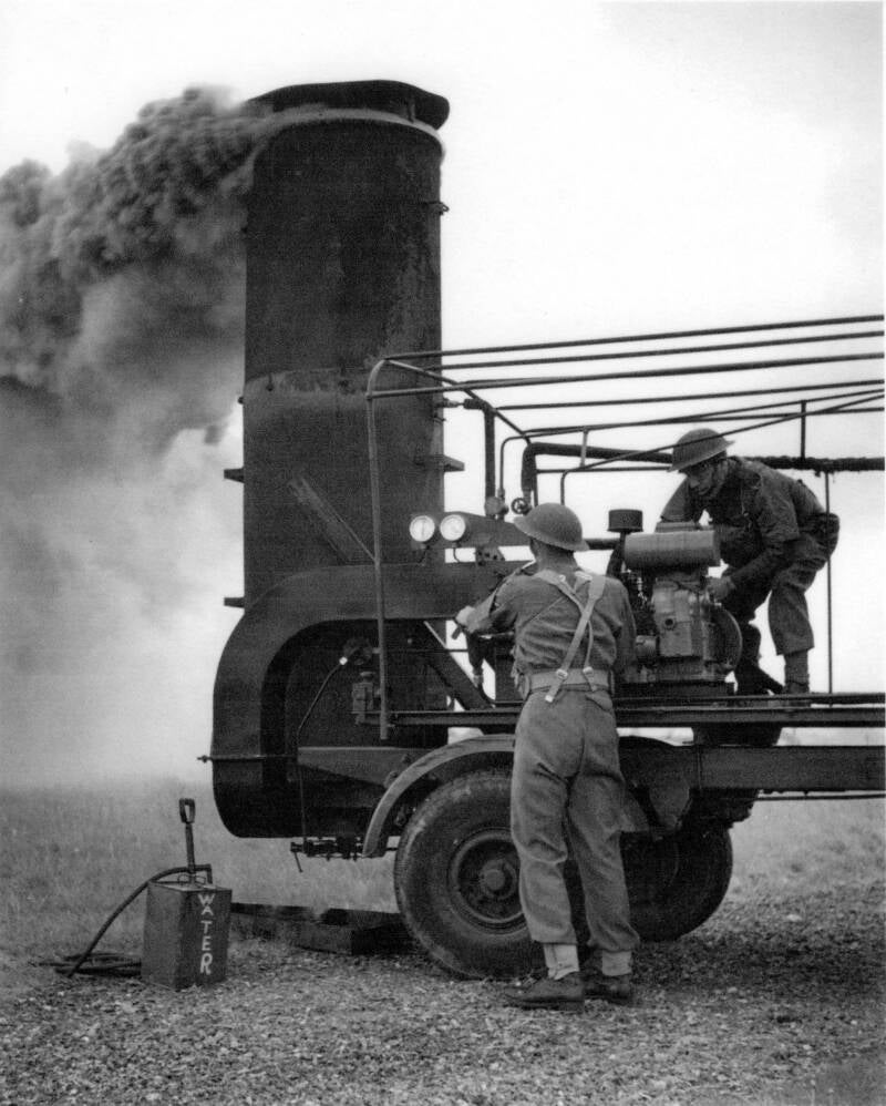 The true development of mass screening by smoke involved the use of chemical generators and the Haslar smoke generator – a large trailer-mounted device that featured oil burning driven by a small water-cooled petrol engine. Trials were also made at Stewartby involving the use of 1,000 modified orchard heaters. In Middlesbrough at the works of Messrs. Dorman Long and Co., a pitch-trough method was trialled. Its success after further modification to conceal emitted light was applied on a substantial scale at Derby and Crewe but didn’t come into general use elsewhere.