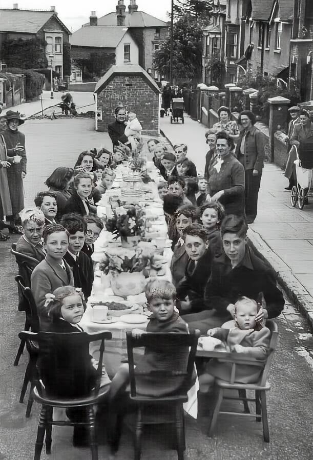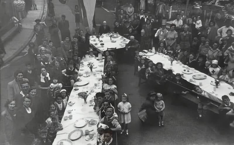 In Cowes scenes reminiscent of the great yachting festivals of pre-war years were enjoyed albeit that the palatial steam and motor yachts were replaced by large transports, tugs and small ships of war that lay at anchor. Crews of each vessel dressed them as gaily as they were able, but ashore the decorations were said to have outstripped anything seen in Regatta week. The whole atmosphere was one of excited expectancy. The residents of Temperance Terrace were noted for the fine repast enjoyed by 50 children at the street party. Cowes was noted for several similar events across the district. Unsurprisingly yet more Hitler’s were torched. A dance arranged by the Council at Northwood House spilled outdoors given the number of attendees.