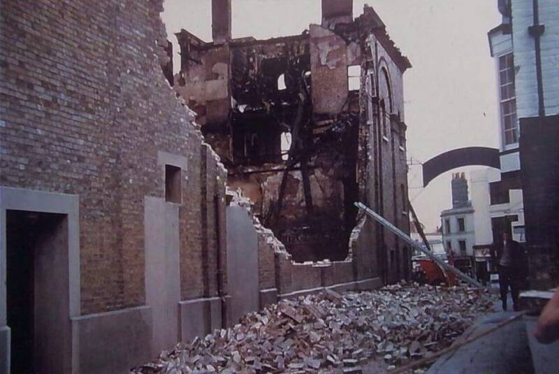 Firemen were busy salvaging the few pitiable objects not consumed by the flames. The numerous offices in the four-storey front of the building were used as an administrative centre for IW Theatres, and scorched chairs and tables were removed from an upstairs window. Barriers were erected and patrolled by Police and crowds of sightseers gathered.