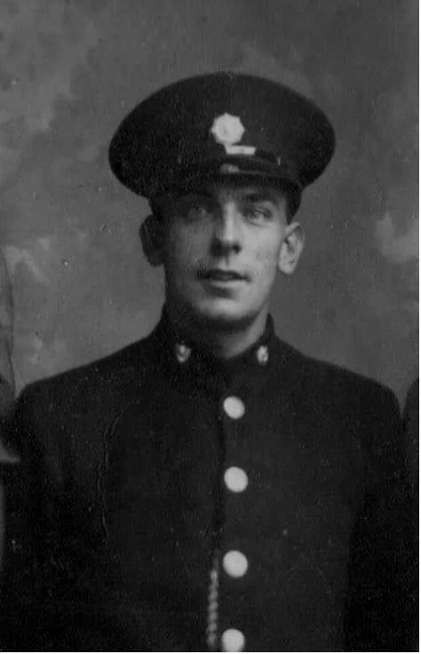 The famously tall Sydney Percy Scott, Hector's father. This photograph taken around the time of the end of the First World War shows his tunic carrying the number '1' badge, indicating his seniority among the firemen but not yet holding officer status.