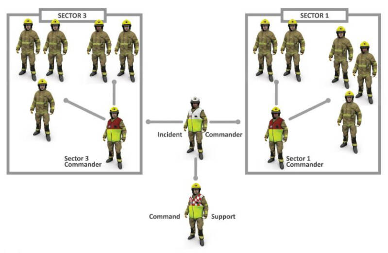 An example of a simple Incident Command System, where the Incident Commander has just three direct spans of control - comprising two Sector Commanders and Command Support.