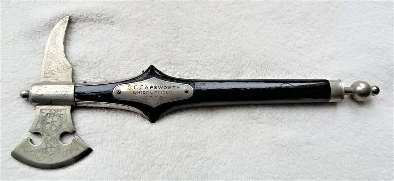 In late 2018, the same year in which the clock returned from America, I was also contacted by a gentleman from Yorkshire who was an avid collector of fire brigade memorabilia. He had acquired a ceremonial axe bearing Sidney’s details and wished to know more about the man behind the name. The collector estimated the axe to have been of a German design from the period 1910 – 1930. Given those dates, it is possible that this was a parting gift given to him on his departure from Ryde. Unfortunately, in this case the contact was unwilling to let the axe return to Ryde, but it is good to know that it is being cared for as part of a collection.