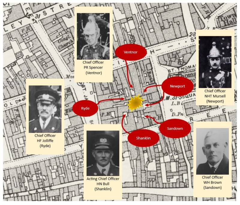 The age of the motor fire engine had come – assistance was forthcoming, rapid, and allowed a far greater weight of fire attack to be undertaken. Never before had this happened on the Isle of Wight, or to Chief Officer Mursell who was suddenly faced with his contemporaries from East Wight all looking to him for his guidance and a combined plan of attack. Among the faces were Chief Officer’s Henry Frederick Jolliffe of Ryde, Wilfred Harry Brown of Sandown, Percy Robert Spencer of Ventnor, and Acting Chief Officer Harry Newton Bull of Shanklin. There was no procedural manual, no precedent had been set, and none of those present had the experience of it in an incredible 162-years of combined service.
