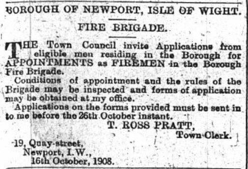 A report appeared in the IW County Press following a Council meeting, including the statement – To reconstitute the Volunteer Fire Brigade as a paid Brigade is a step in the right direction, as whilst such recognition is due to the firemen, it will ensure that full public control which is practically universal in this important branch of the public service. The town will forever be indebted to the Newport Volunteer Fire Brigade for stepping into the breach at a time of emergency and evidencing truest patriotism in the interests of the old borough and its inhabitants.