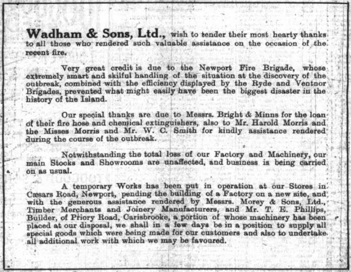 A thank you placed in the County Press by Wadham & Sons. Why they chose not to include Sandown and Shanklin fire brigades is a mystery.