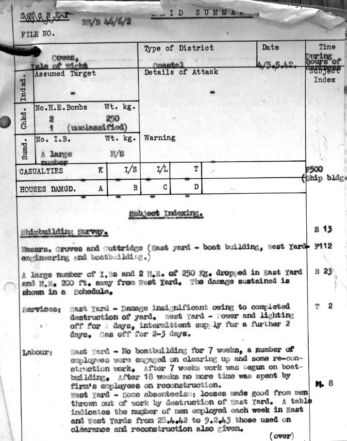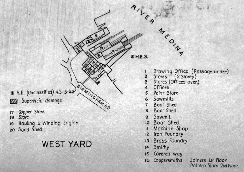Groves and Gutteridge maintained sites on both sides of the Medina undertaking work of national importance. During the attack of 4/5 May 1942, only a few high explosive bombs had a direct effect on both, but the proliferation of innumerable 1kg incendiary bombs had a devastating effect on production at the East yard.