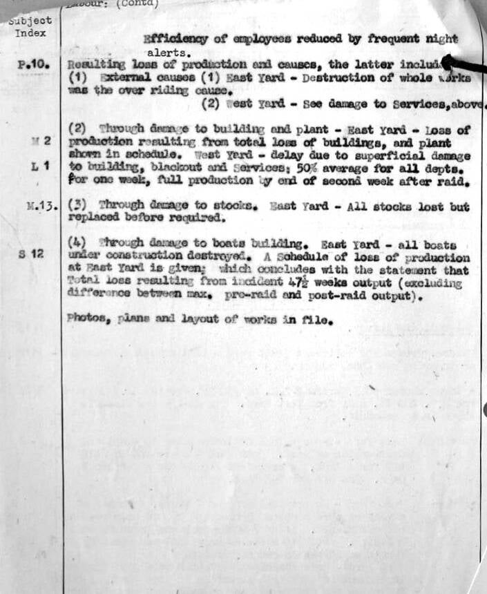 Damage – the whole of the works at the East Yard together with office premises were gutted. The office premises were completely destroyed together with the firms’ books so that pre-raid figures for wages and production figures are not available, the unit value is therefore based on man-hours calculated on post raid production and organisation.202 workers normally employed. For 7 weeks no boatbuilding was done at this yard, though a number of the employees were engaged on clearing up and some reconstruction work. After a further 18 weeks no more time was spent by the firm’s employees on reconstruction and the number of employees engaged on boatbuilding steadily increased to 150 after a further 18 weeks. After this period (2.4.43) no further increase was expected owing to the limited number of men available. 17 boats from 45’ to 72’ were destroyed in the fire, representing approximately 27 weeks output.
