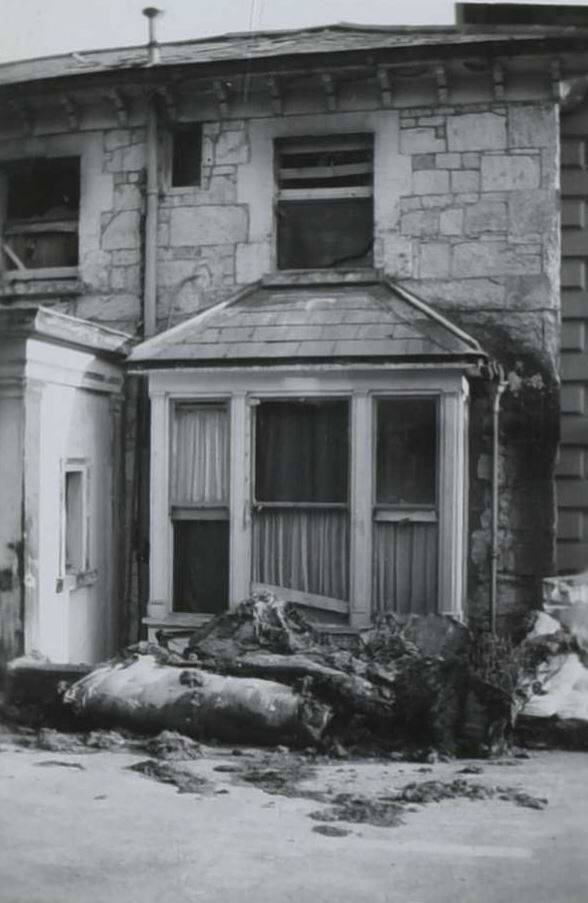 Looking due north across the two demolished hotels, showing a stone building appearing intact. Actually, both flank walls are split and the building is considered 'B' damage by the local surveyor.
