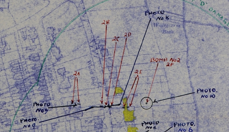 1F – Final position of Bomb No.1 in front of YMCA Hostel – size of crater 22’ x 6’. Photograph No.5 shows the point of detonation at A and a general view of the damage to the YMCA Hostel together with the position from which Photographs 3, 4, and 6 were taken at C., D, and E. respectively. Photograph No.6 shows the crater as seen from the First Floor of the damaged Hostel.