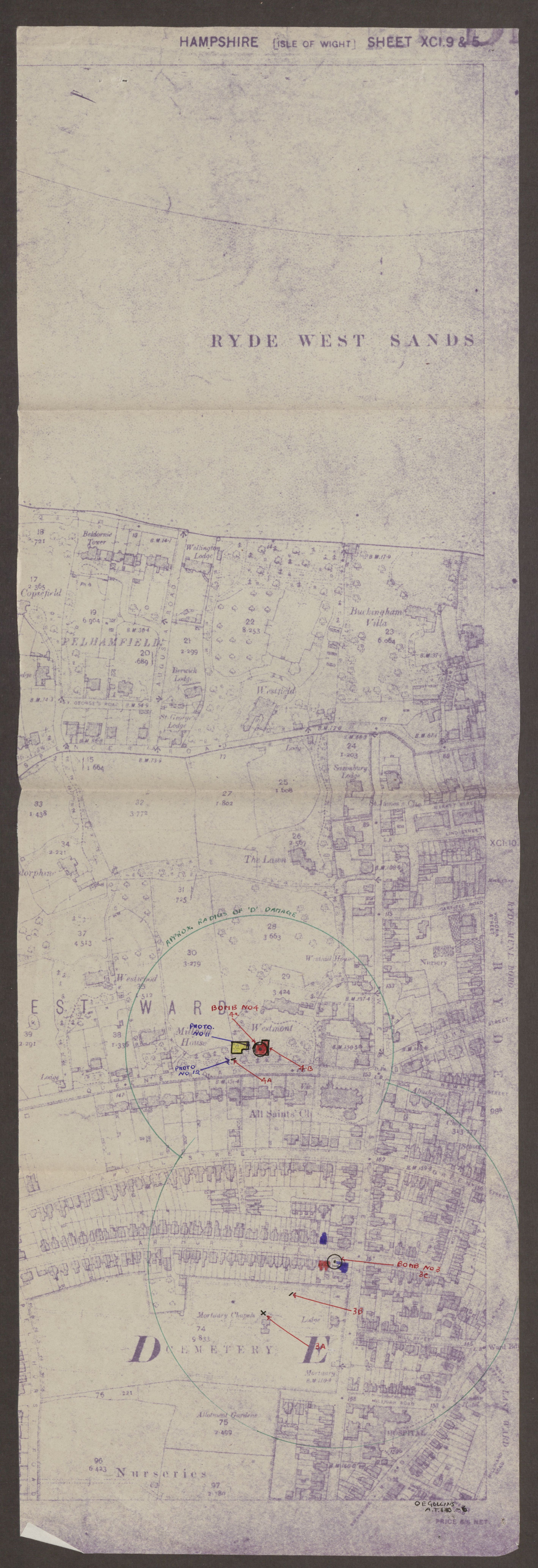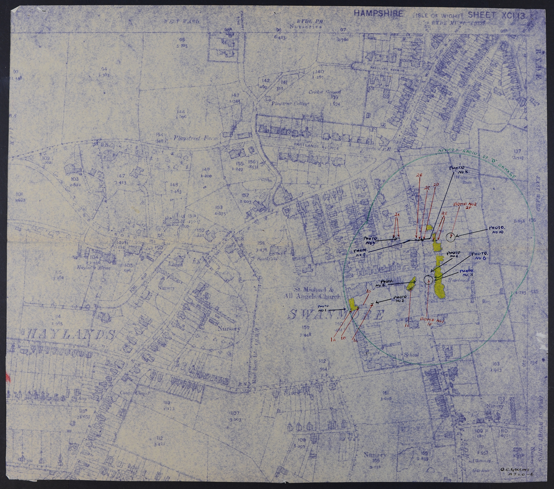 As was the custom, the R&E investigator, Mr O.E. Gollins, recorded the bombs numerically, but this doesn’t necessarily define the order in which they fell. Tip-and-run raids typically lasted less than two minutes, and in some cases just a few seconds, and in all likelihood no-one would have recalled or recorded such detail. Captions attached to photographs below are verbatim as they appear in the original report. In many cases the investigator has drawn lines with corresponding alphabetical references that relate to the caption, for that reason, where appropriate, scans of photographs are broadened to include handwritten extracts on the page to which they were originally applied with adhesive. Unusually for an R&E report that features the Isle of Wight, B16/27/1 includes two Ordnance Survey maps overlaid with handwritten references, which are also included in the appropriate place below.