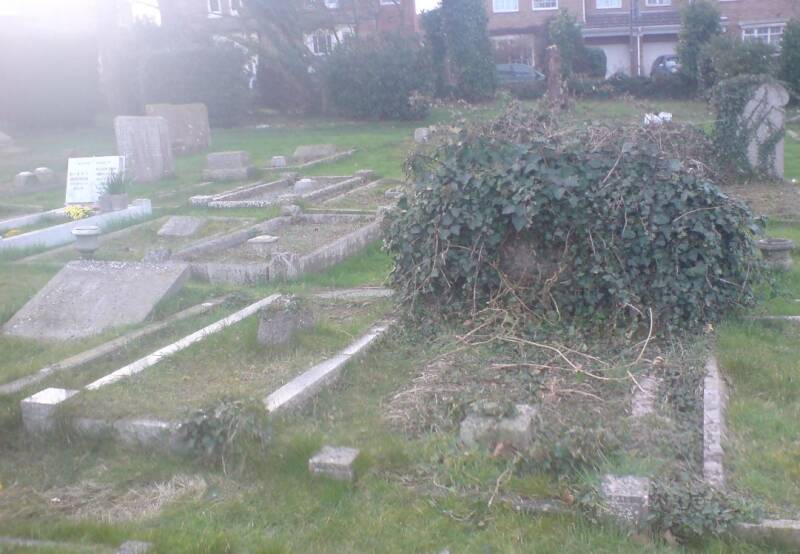 The graves of Herbert Dewey (left) and Colin Weeks (beneath the leaves) as we discovered them in 2007. A small gap in the leaves is where I pulled at the growth to reveal sufficient details of the headstone to be sure we had the correct one. The headstone had evidently been protected by the growth for many years and was in virtually new condition. When Colin's father Henry passed away in February 1955, as per his request he was interred in the same plot with his teenaged son.