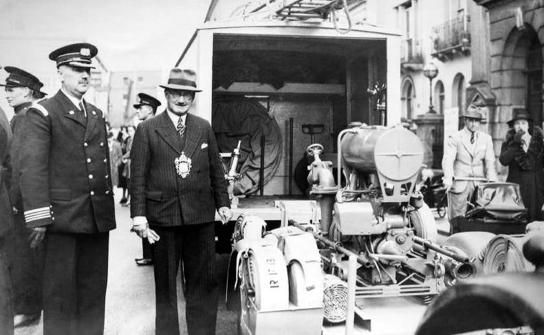 On the left, Chief Officer Max Heller is showing the Mayor (Colin's father) around the service's equipment in Lind Street during the events described above.