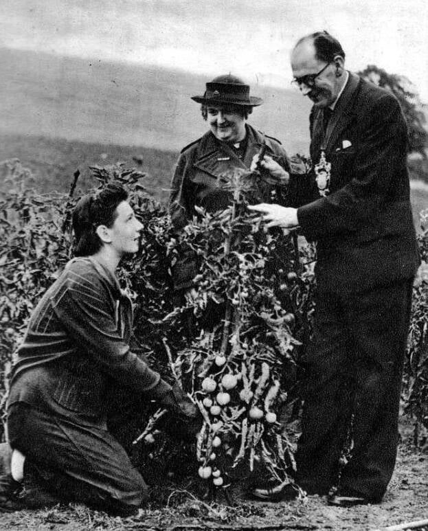 Francis Joseph Raven Needham was the son of Mrs. Sylvia Needham, deputy-mayor, seen here with the Mayor and a land girl photographed while visiting the Mayor's tomato growing initiative at Knighton.